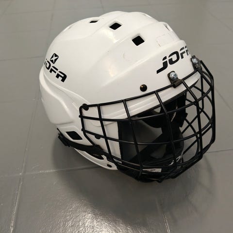 JOFA jääkiekkokypärä, koko 49-56, väriltään punainen. Kypärän koko voi säätää ja siinä on säädettävä leukahihna.