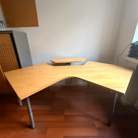 Pöydän vasenpuoli on n.66.5cm korkealla kun oikeapuoli on n.61.5cm korkealla. Pöytä ei nouse eikä laske. Käytönjälkiä löytyy jonkinverran.