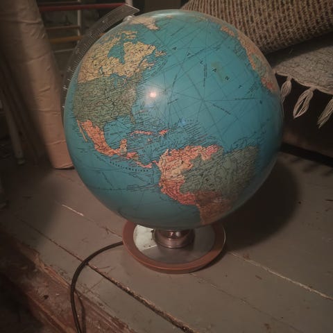 Kuvanmukainen karttapallo 70-80 luvulta. Valo toimii.