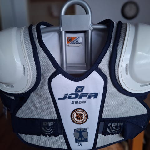 Myydään Jofa 5500 NHL -hartiasuojat juniorikokoa. Alkuperäinen NHL-lisensoitu malli. Koko 1 JR XXS / JR XS, sopii noin 120 cm pituudelle, rinnanympärys noin 70 cm. Suojat ovat käytetyt, mutta yleiskunto on hyvä, pehmusteet ovat ehjät, tarrat toimivat ja rakenne on kunnossa. Näkyy normaaleja käytön jälkiä, mutta ei repeämiä eikä vaurioita. Kaikki näkyy kuvissa, kuvat ovat osa kuvausta.