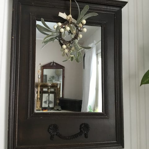 Peili ruiskumaalattua massiivista pähkinäpuuta. Korkeus 158 cm. Leveys 39 cm. Syvyys 6 cm. Kokonaissyvyys avattuna 37 cm (alhaalta).