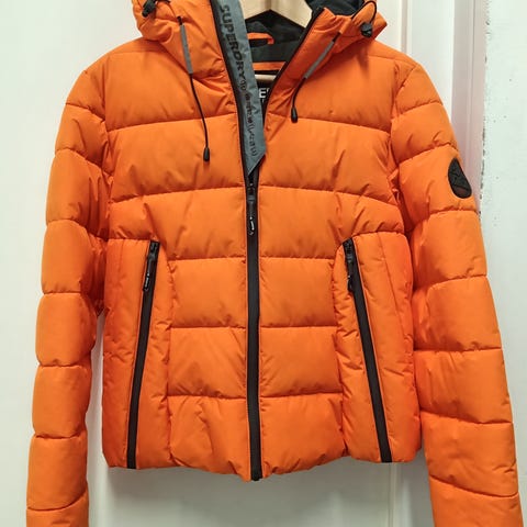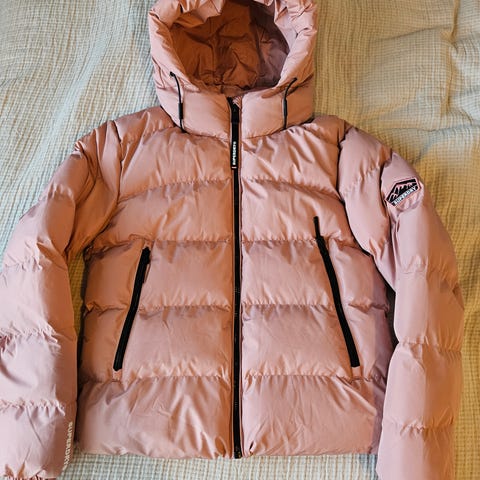 Siistissä kunnossa. Koko 38. XSuperdryn pitkä kiiltävä talvitakki. Tilava huppu, jossa kiristykset. Itsellä pituutta 161 cm.
