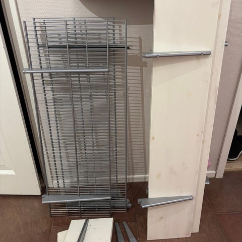 Elfa Classic lankahylly 30,5cm x 44,5 cm, 2kpl lankahyllyn kannatin, 2kpl tankopidin lankahyllyn kannattimeen ja ripustustanko 45,5cm (toisen pään muovitulppa puuttuu, ei vaikuta käyttöön)