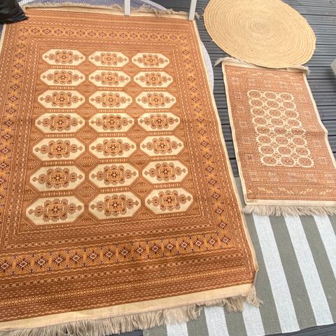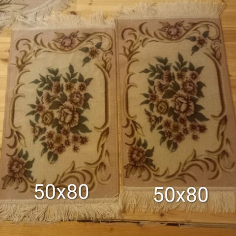Kaksi erikokoista, mutta samanväristä itämaista mattoa. Toinen 120x60cm ja isompi 200x80cm. Tupsuja ei ole laskettu mittoihin mukaan. Voi hakea myös erikseen, jolloin voidaan sopia hinnasta!