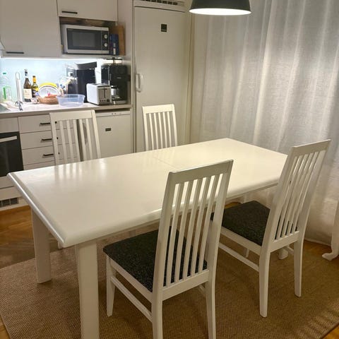Ruokapöytä, korkeakiilto, valkoinen. Pöytä soveltuu ruokailuun ja muihin kodin käyttötarkoituksiin. Pöydässä 50cm jatkopala. Tuolit saa halutessaan mukaan. MUUTTOMYYNTI, KIIRE! Ei kuljetus mahdollisuutta.