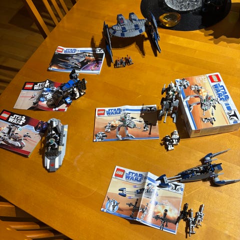 Vanha LEGO Star Wars -setti numero 7662 eli Trade Federation MTT rakennettuna, pölyinen mutta hyvässä kunnossa. Droideka puuttuu (ellen vielä löydä varaston uumenista), muuten kaikki osat kuvien mukaisesti tallessa ja ehjiä. Laatikkoa tai ohjekirjoja ei ole.