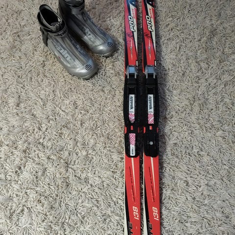 Suksien pituus 154 cm, sauvojen 140 cm. Suksissa SNS Pilot-siteet eli vaatii kaksirautaiset monot. Suksia paljon käytetty, mutta edelleen käyttökelpoiset. Kulkeutuu omien menojen mukaan Lpr.