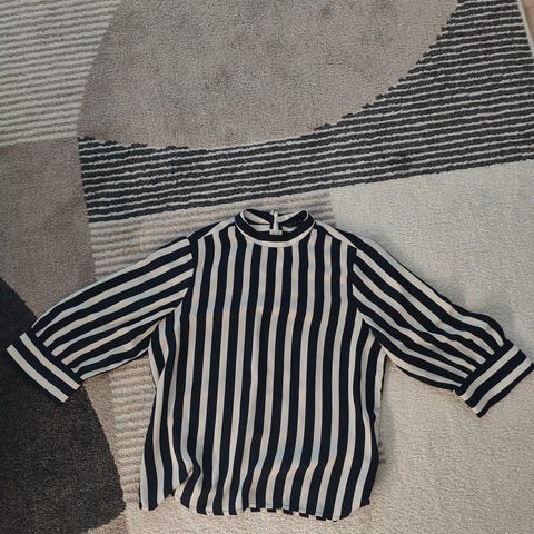 Joustava pitkähihainen pusero jossa on mustavalkoinen ja keltainen kuvio, takana kiristysnaru, kevyt ja ilmava kangas.