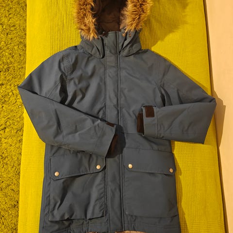 Siisti ja lämmin parkatakki koossa 160cm. Ainoat huomioitavat asiat; oikeanpuoleisen rintataskun vetoketju rikki, vasen toimii moitteettomasti ja edessä ylhäällä kauluksessa kulumista. Molemmista kuvat. Kumpikaan ei haittaa käyttöä eivätkä oikeastaan edes näy ulospäin.