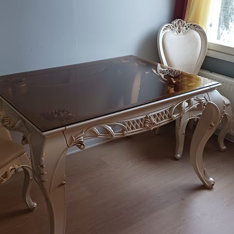 Cubic & cubic ruokaryhmä kuudella tuolilla. Lasilevy pöydän päällä. Liian iso uuteen kotiin. Koiratalous Turenki.