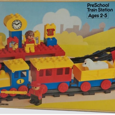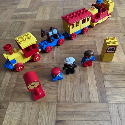 Myydään suuri setti aitoja vintage Lego Duploja 1990-luvulta. Setti sisältää mm. junaradan, veturin, vaunuja, auton ja asuntovaunun, traktorin, hevosen, koiran sekä erilaisia hahmoja 16 kpl ja peruspalasia, joista voi koota vaikkapa hevostallin ja asemarakennuksen, ks. kuvassa.