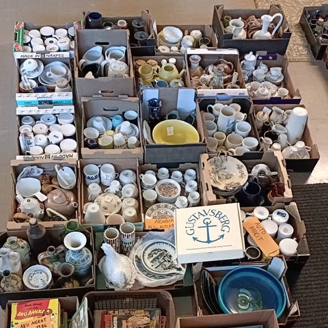 Sininen posliiniastiasto, johon kuuluu useita kannuja ja maljakoita, teekannu tai kahvipannu kannella, kuppeja ja aluslautasia sekä pieni kaadin. Astiat ovat tummansinisiä valkoisella reunuksella. Sopii kattaukseen ja tarjoiluun esimerkiksi kahvi- tai teehetkiin sekä koristekäyttöön. Merkitsemätön valmistaja ja malli.