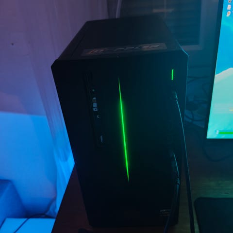 Dell työpöytätietokone, sisältää kotelon jossa näkyvissä jäähdytyspuhaltimet ja sisäiset komponentit. Mukana näyttö, näppäimistö ja hiiri. Tarkemmat tekniset