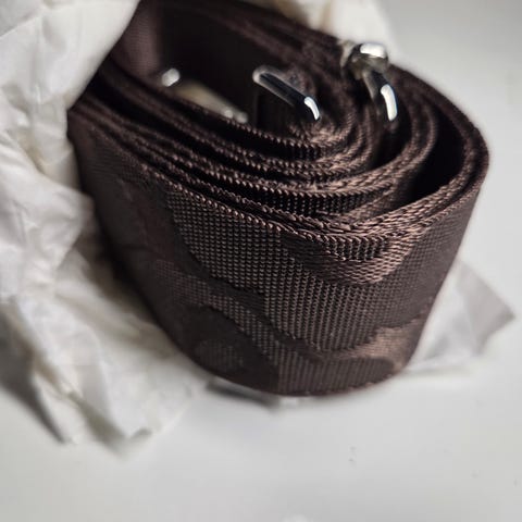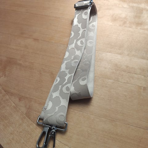 Marimekon Gratha laukun uusi musta unikko kuvioinen hihna.
