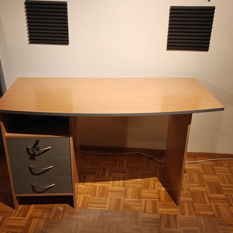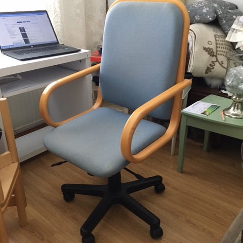 Tuoli on päällystettynä edelleen käyttökelpoinen ja mukava istua. Korkeuden säätö vain välillä luistaa.