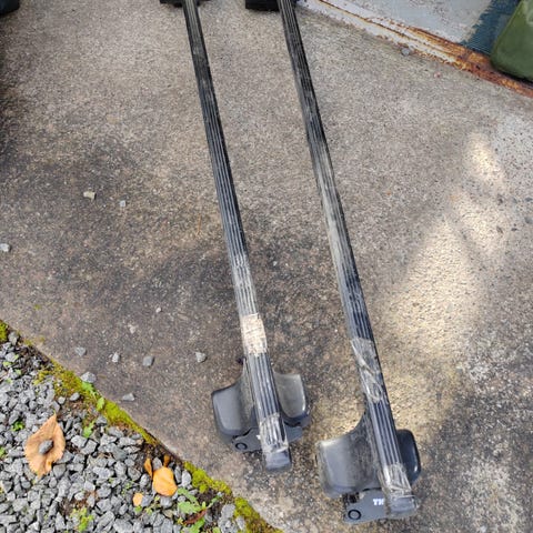 Telineet kiinnitetään kaiteeseen katon ja kaiteen välistä. Sopii useaan malliin. Nämä ovat olleet Volvo V70:n katolla. Asennus ei vaadi työkaluja. Lukittava malli, kaksi avainta.