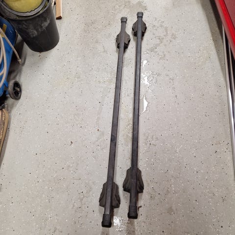 Kahdesti käytetyt telineet autoon, jossa on integroidut kattokaiteet. Säädettävä leveys. Avain tallella. Kiinnitetään paikalleen kuusiokoloavaimella.