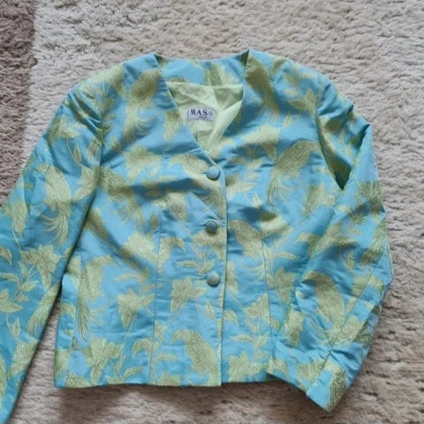 Bleiseri. Kiinnittyy hakasella. Hihoissa kivat rypytykset. Taskut edessä. Laput poustettu ja soviteltu, isoksi todettu, joten uutta vastaava.