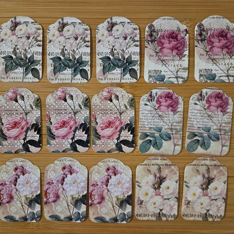 Setti nro 3. Romanttiset vintage henkiset pakettikortit kukka ja sydän kuvioilla. Yläosassa irrotettava pieni ympyrä nauhaa varten. Toki voi käyttää myös muutenkin askartelussa ja skräppäyksessä.