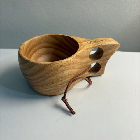 Kestävä Nortrek-puukuksa nuotiologolla. Kuksa on FSC-sertifioitua kumipuuta ja erittäin kestävä. Vetoisuus 1,6 dl.