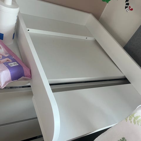 Hyväkuntoinen Ikean Småstad hoitopöytä. Kaapin mitat K 102 L 90 cm S 49 (laatikon etureunaan 50 cm). Taso 77x85,5 cm. Tason voi laittaa kahdelle eri korkeudelle. Tason alapuolella etukulmissa on jäljet kulmasuojina olleista vaahtomuovipaloista.