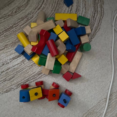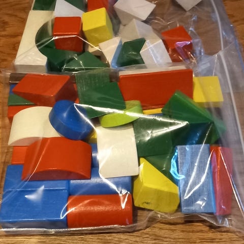 Puisia rakennuspalikoita, monia muotoja kokoja ja värejä. Noin 100kpl. Sekä 15 kpl puisia kuutiota joiden sivuilla numeroita ja laskumerkkejä. Näiden avulla voi harjoittelua laskuja.