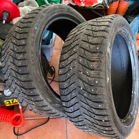 Hyvät nastarenkaat pintaa n. 7 mm kaikki nastat paikallaan vähän kuluneet mutta hyvät. Ei sopineet minun autoon pyörimään.