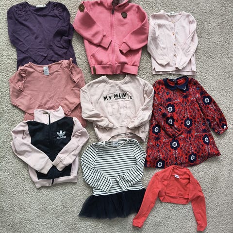2 T-paitaa. Farkut (vyötärö säädettävä. Kangas pehmeä ohuehko), 4 leggingsit (itse tehtyjä kuminauha edelleen ok, nämä ovat vyötäröstä napakammat kuin yleensä kaupasta ostetut. )