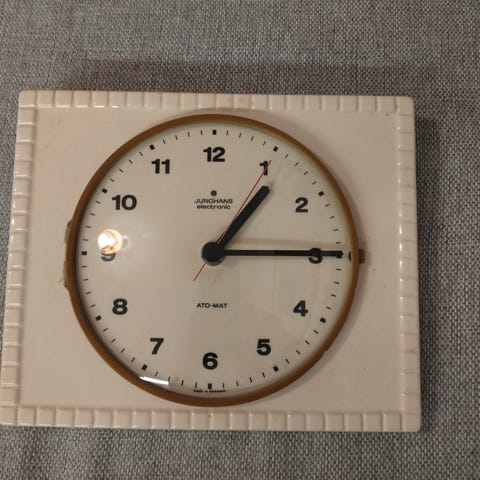 Tyylikäs vedettävä seinäkello vuodelta 1962. Lyö tasatunnein kellonajan mukaisen määrän sekä kerran puolen tunnin kohdalla.