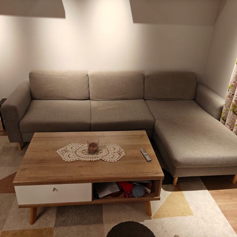 Runko ehjä. Kätisyys ei vaihdettavissa. Kankaat kaipaa pientä pesua, ja tuossa rahin kohdalla pieni kipinän polttama reikä. Tästä puuttuu päädystä toinen pala, meillä ollut seinää vasten. Saa noi kiinnikkeet tuolta irtikin toki.
