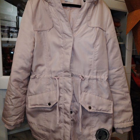 Kuvanmukainen talvitakki, sisävuori kainalosta hiukan ratkennut. Kauluksissa sisäpuolella hieman meikkivoidetta, kun ei ole pesty edellisen käytön jäljiltä.