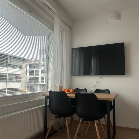 siistikuntoinen ruokailuryhmä, tuolit uuttavastaavia, pöydässä muutama pieni jälki