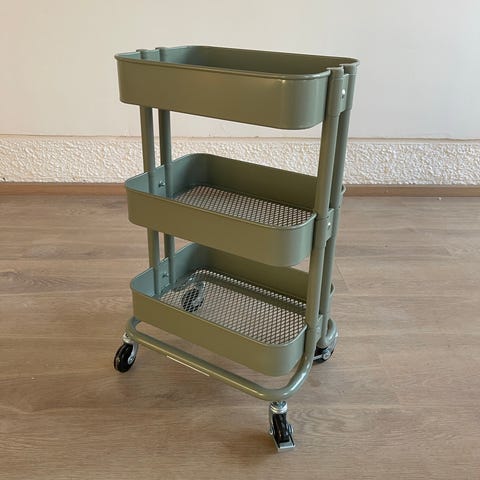 Ikean mintunvihreä metallikärry. Mukaan bambuinen päälilevy. Levyssä joitain yksittäisiä kestotahroja. Muuten siistikuntoinen.