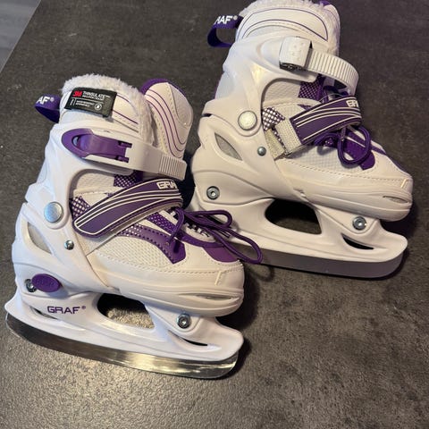 Graf adjustable skates, size 31-34, color white and purple. The skates are equipped with laces and Velcro fastening, the inner lining is soft and warm.