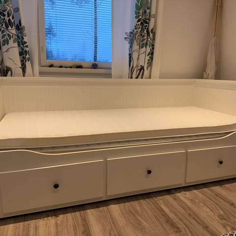 Puinen levitettävä sohvasänky. Kaksi säilytyslaatikkoa. Malli Ikea Hemnes. Vaatii hieman korjausta "patjaritilän" osalta. Myydään pois muuton tieltä. Vain nouto.