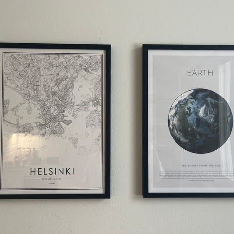 Juliste, jossa maisemakuva Monacosta, siniset kehykset ja keltainen matto. Kehystetty seinäkoriste, joka esittää luonnonmaisemaa merimaisemalla ja kasvillisuudella.