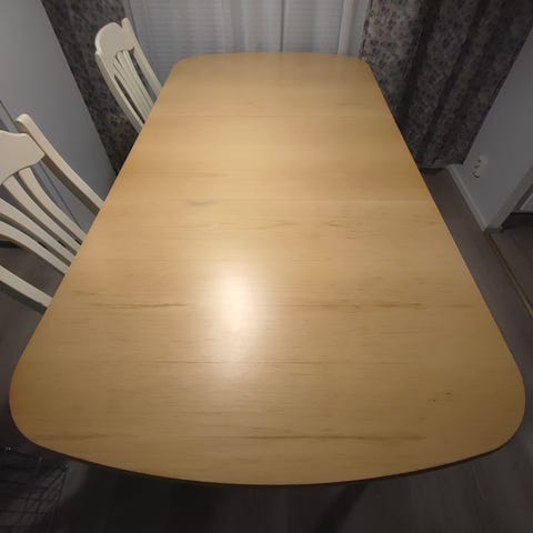 Ruokapöytä kahdella tuolilla, täysipuinen. Ei virheetön mutta ehjä ja tukeva, jalat saa tarvittaessa irroitettua kuljetusta varten. Nouto.