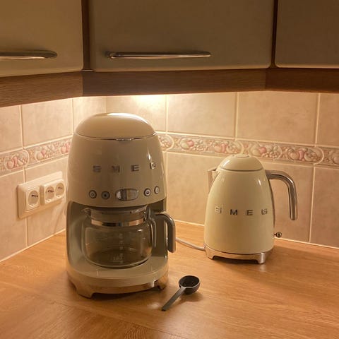 Smeg kahvinkeitin valkoisella värillä. Laite on suunniteltu kotitalouskäyttöön ja siinä on lasinen keittokannu. Kahvinkeitin sisältää perustoiminnot kahvin valmistukseen.