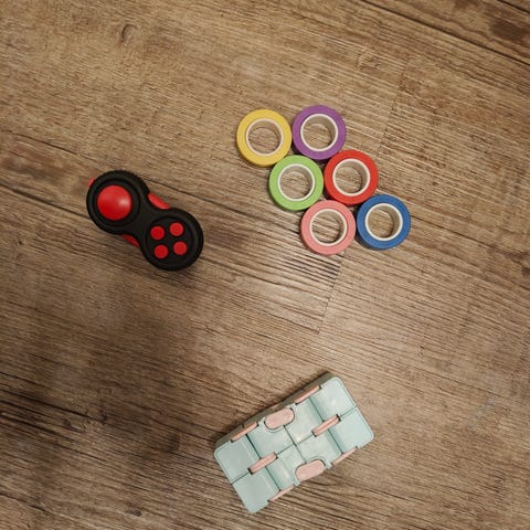 Fidget Cube on pieni motoriikka lelu, jossa on useita erilaisia säätimiä ja painikkeita. Se on valkoinen ja tarkoitettu käsien aktivointiin ja keskittymisen parantamiseen. Lelu sisältää kytkimiä, pyöriviä osia ja liukusäätimiä, jotka tarjoavat erilaisia kosketus- ja liiketuntumia.
