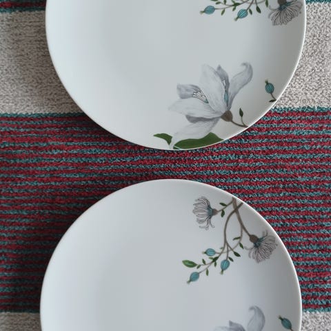 Kuusi ehjää, siistiä, vähän käytettyä Clematis- sarjan lautasta. Kuusi matalaa ruokalautasta, halkasija 27 cm. Yhteishinta. Postitus onnistuu. Postikulut lisätään.