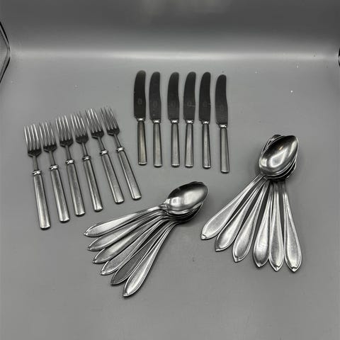 Vuosikymmeniä vanhat kotimaiset haarukat, veitset ja lusikat. Desing Kaj Franck. Paljon käytetyt, mutta edelleen täysin käyttökelpoiset. Muutama tummentuma, lähtee varmaan oikealla aineella. Yhdessä veitsessä erottuu Hackman-Sorsakoski-leima, kaikissa lusikoissa teksti Sorsakoski. Pituudet: veitsi 20,5cm, haarukka 17,5cm, lusikka 18cm sekä 17cm. Jokaista 4 kappaletta.