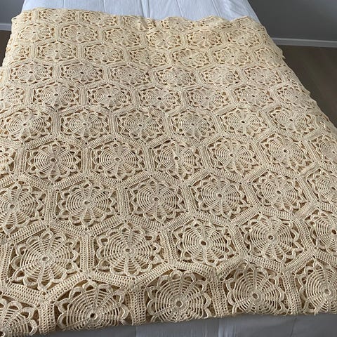 Vahvasta kalastajanlangasta, käsinvirkattu sängynpeitto yksikkösänkyyn. Kerran pesty. sitten levännyt kaapissa.