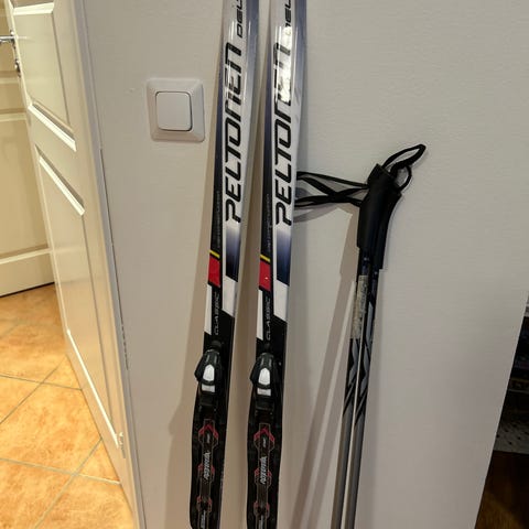 Peltonen Delta sukset 170 cm ja Omega sauvat 125 cm. Lähes uuden veroiset.