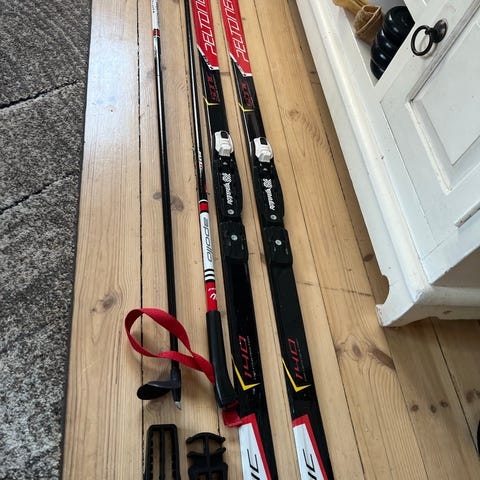 Visu sukset, pituus 130 cm. Sukset ovat käytettyjä ja niissä on nnn kiinnikkeet. Käytön jälkiä on mutta pääsee eteenpäin hyvin. Sauvoja ei ole.