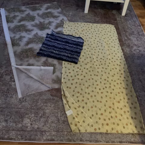 Erilaisia kangaspaloja, joissa erilaisia kuvioita ja värejä. Sisältää esimerkiksi vaaleanpunaisia, violetteja ja sinisiä sävyjä, sekä kuvioita kuten pilkkuja, kukkia ja meriaiheita. Kangaspalat ovat erikokoisia ja erilaisista materiaaleista. kapea kangas on putkea.