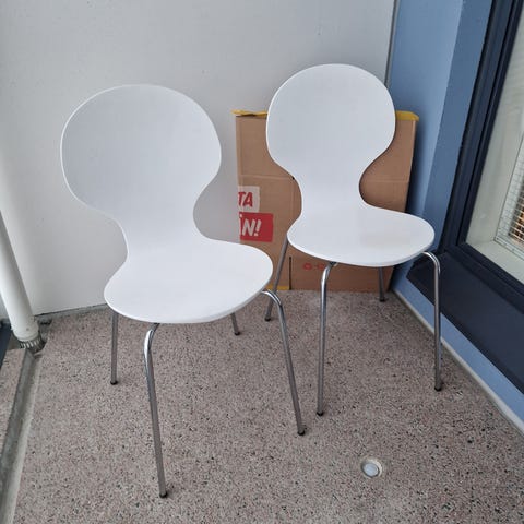 Myydään 2kpl valkoisia tuoleja. Ollut meillä lapsilla, joten löytyy esim. kynän jälkeä jostain kohtaa. En ole kokeillut tahrapoistoja tms. Ehjät kuitenkin.
