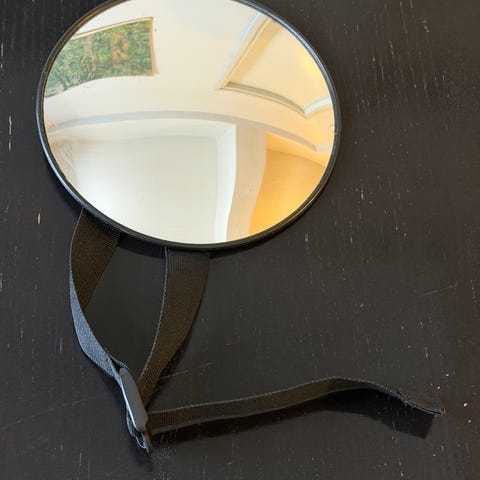 Käytössä ollut takaistuinpeili. Siisti ja täysin ehjä. Peili auttaa näkemään selkä menosuuntaan turvaistuimessa kulkevan lapsen kasvot. Peili rauhoittaa lasta, kun hänellä on näköyhteys vanhempaan. Peili on helppo kiinnittää auton istuimen pääntukeen ja sen saa asennettua haluttuun kulmaan.
