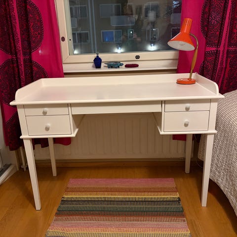 Arena-työpöytä 120 x 45 cm, ostettu Veke-liikkeestä. Valkotammen sävyinen melamiinipinnoitettu pöytä on kestävä ja helppohoitoinen. Pöydässä on kaappi ja vetolaatikko, jotka tarjoavat kätevää säilytystilaa opiskeluun tai työskentelyyn.