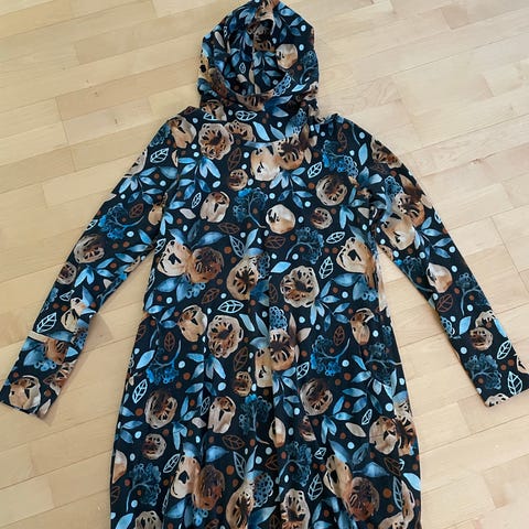 Versonpuodin hupullinen mekko. Sivuissa taskut, helmassa kuminauha. Koko XL.