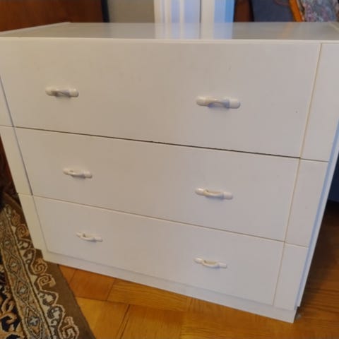 Annetaan kuvan mukainen valkoinen lipasto. Keskellä kolme vetolaatikkoa, sivuilla hyllyt. Meillä päällä ollut 3 harmaata kivilaattaa. Ne saa mukaan halutessaan, mutta eivät ole kiinni lipastossa. Nouto Herttoniemenrannasta.